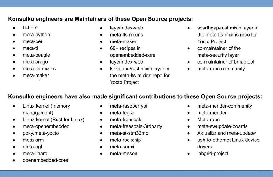 Throughout 2025, Konsulko engineers maintained their seats on the OpenEmbedded Board of Directors and the Yocto Project Technical Steering Committee, and played a key role in organizing and presenting at multiple community events. Our engineers continue in the role of project maintainer and make significant contributions to numerous Open Source projects.